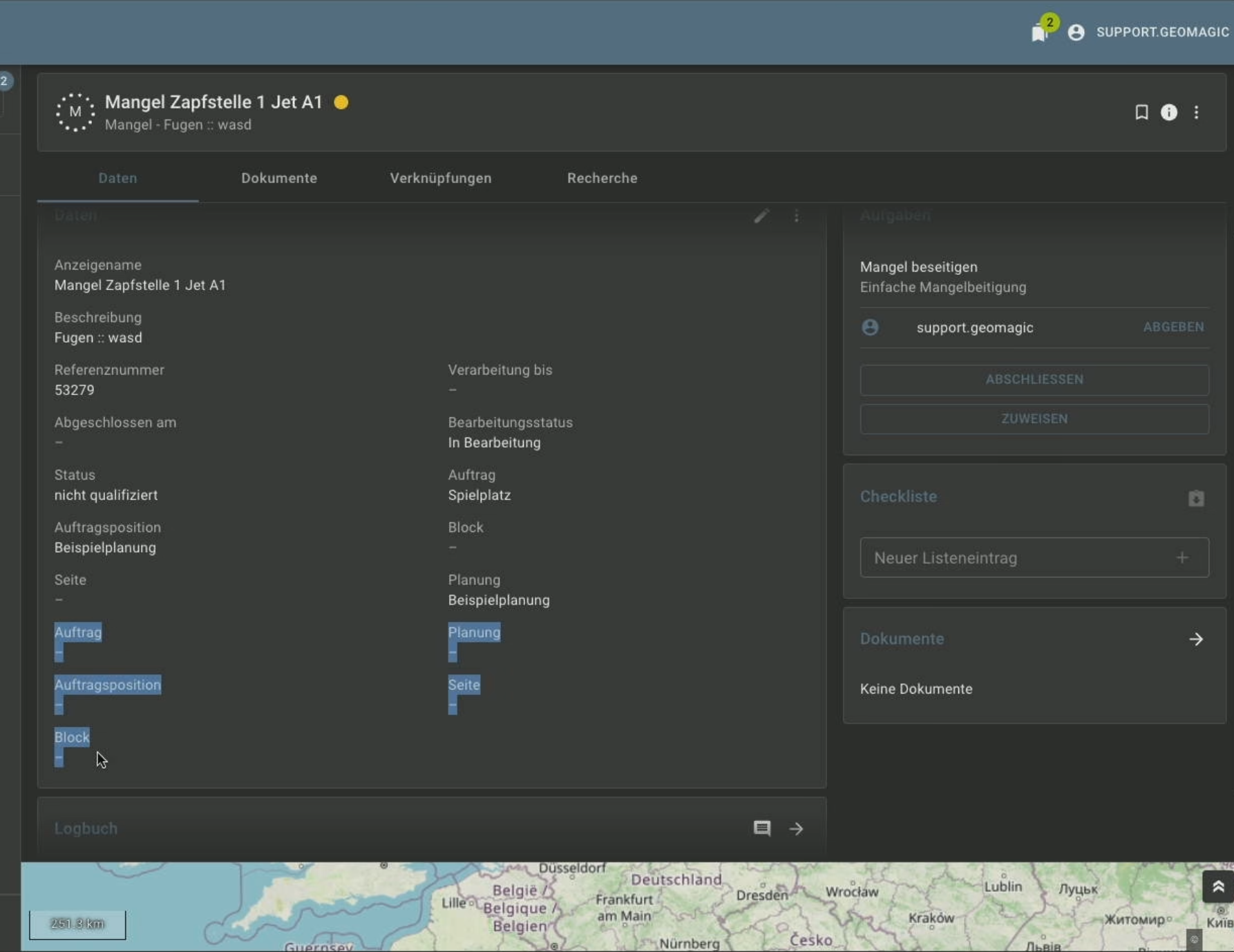 Erstellung von Meldungen: Beim Ausfüllen eines Formulars kann der Zustand auf "Mangelhaft" gesetzt werden, was automatisch eine Meldung/Dispatch generiert, sobald die Auftragsposition(Assignment) und das Formular abgeschlossen sind.